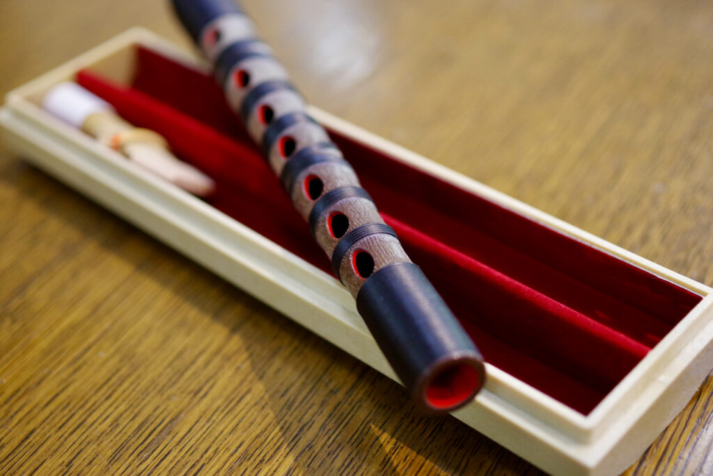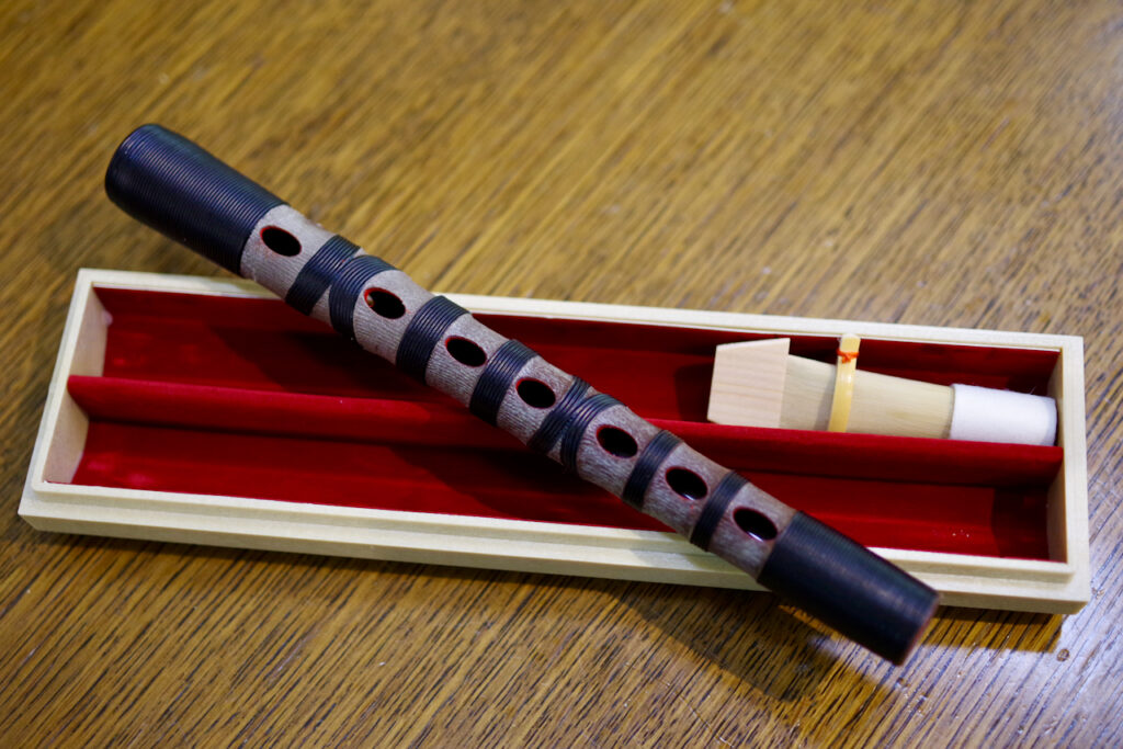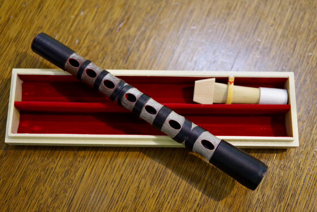 日本の最も古い古典音楽の雅楽で使われる横笛で、能管、篠笛など横笛の原型といわれています。雅楽の楽器の中では広い2オクターブの音域(E5~D7)をもち、低い音から高い音の間を縦横無尽に駆け抜けるその音色は「舞い立ち昇る龍の鳴き声」のようで、名前の由来になっています。雅楽では、ひちりきが主旋律を奏し、龍笛が同じ旋律をやや装飾的に奏します。