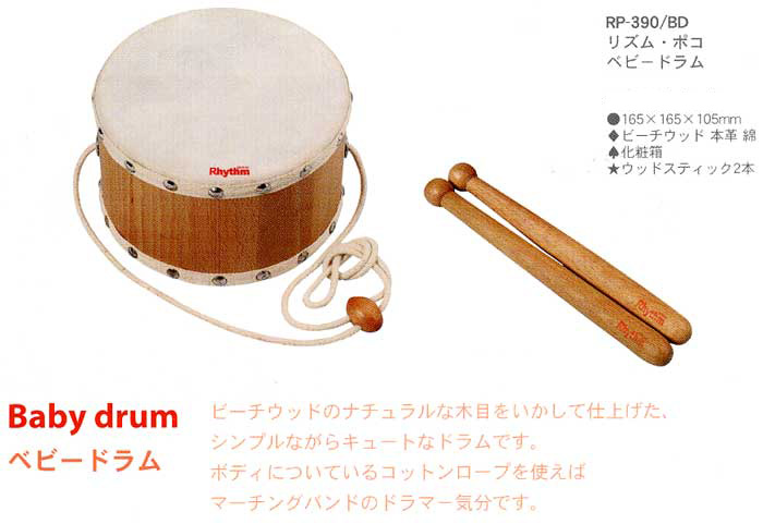 リズムポコミニミニドラムセットRP-1000/DS レザー、木材(ビーチウッド)、真鍮 商品寸法 (長さx幅x高さ) 135×315×155mm 付属 ドラムスティック2本組 ¥11,000