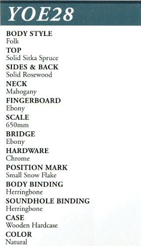 S.ヤイリYO28 トップ:シトカスプルース単板 サイド&バック:ローズウッド単板 ネック:マホガニー フィンガーボード:エボニー スケール:650mm/20f ブリッジ:エボニー ハードウエアー:クローム ポジションマーク:ドット ボディバインディング:マルティプル サウンドホールバインディング:マルティプル カラー:ナチュラル、ヴィンテージサンバースト ハードケース付 完売 |