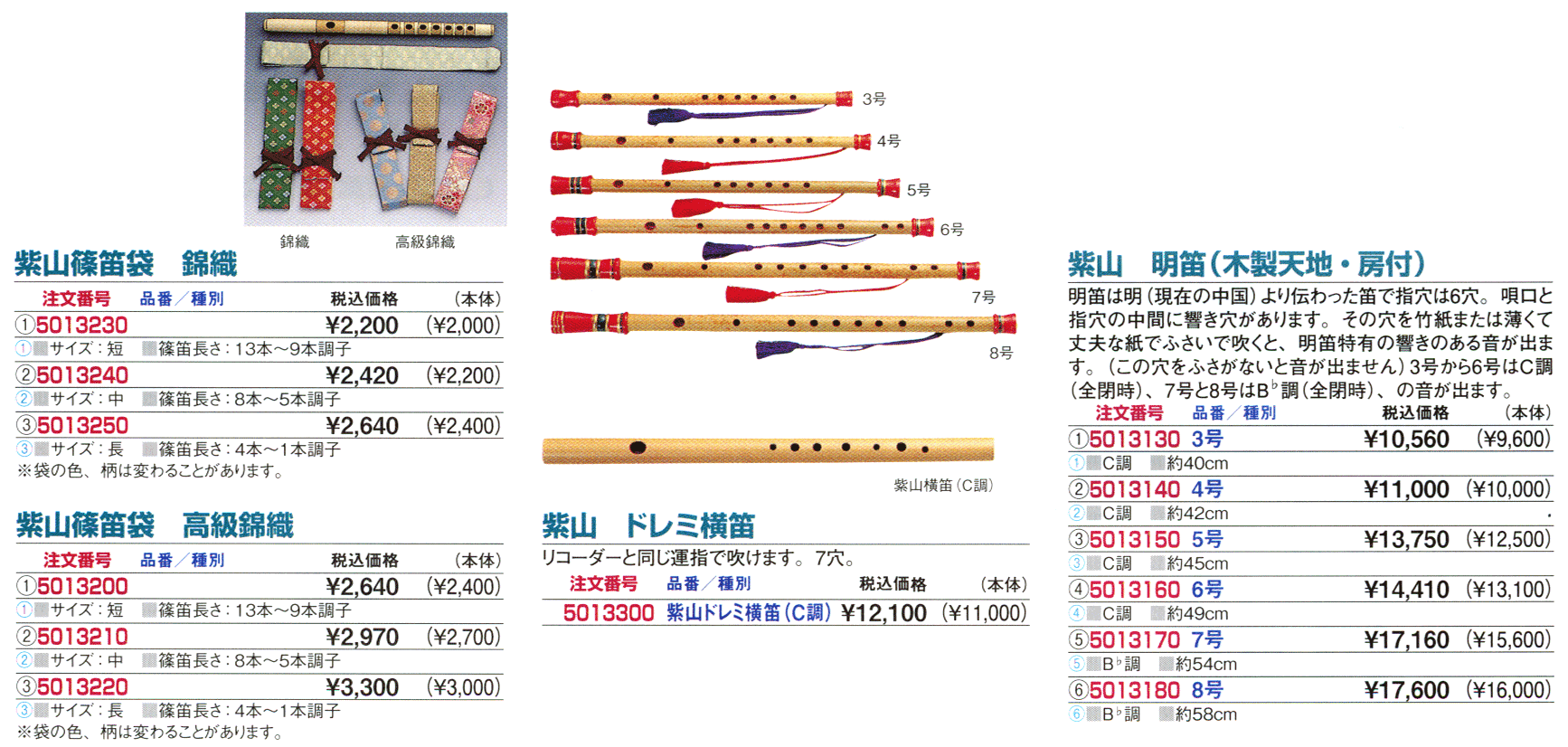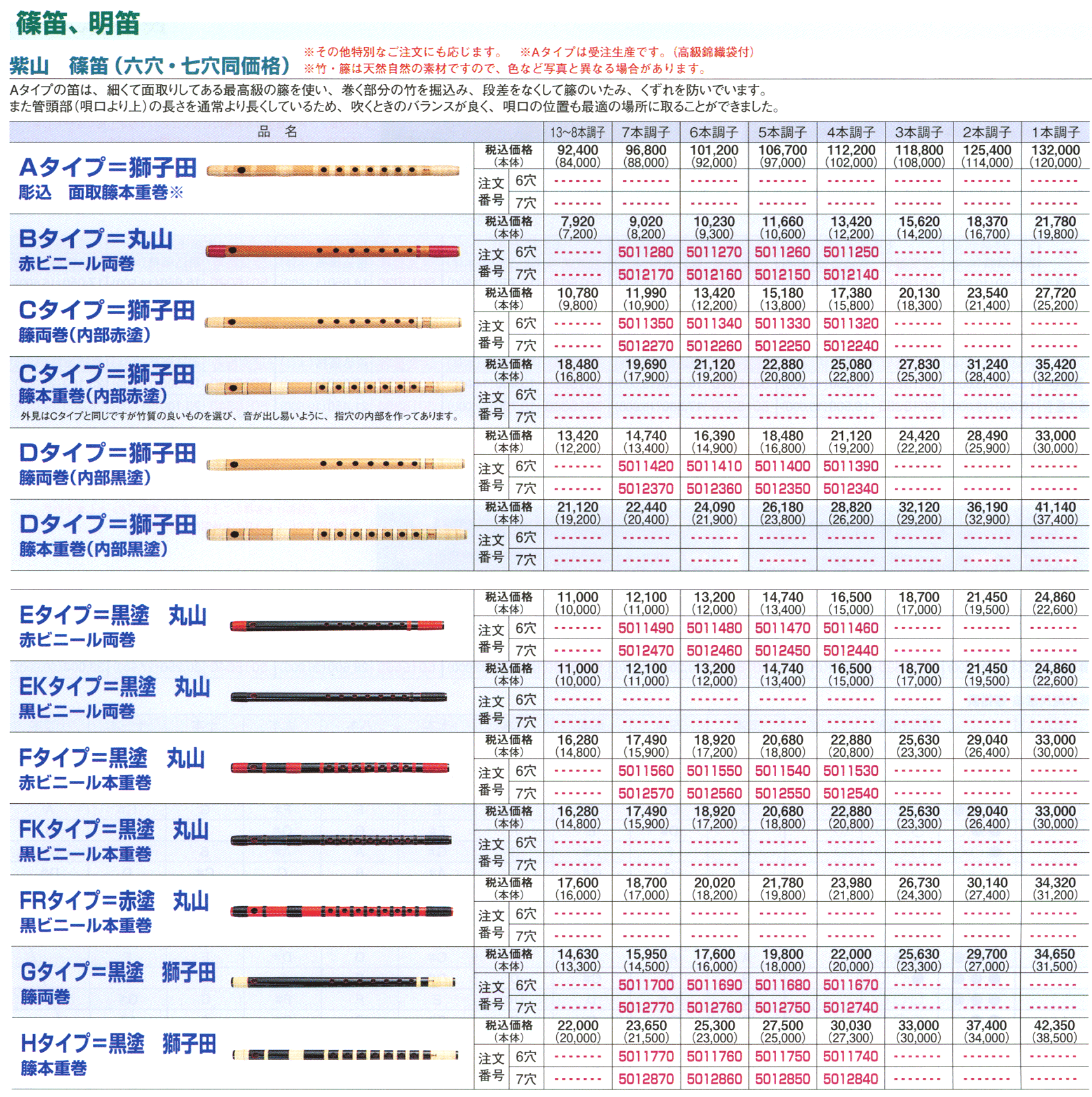 ★ご注文の際には、仕様(タイプA〜H)・調子(1〜13本)・指孔(6穴と7穴)を必ず明記してください。詳細は篠笛の知識をお読みください。