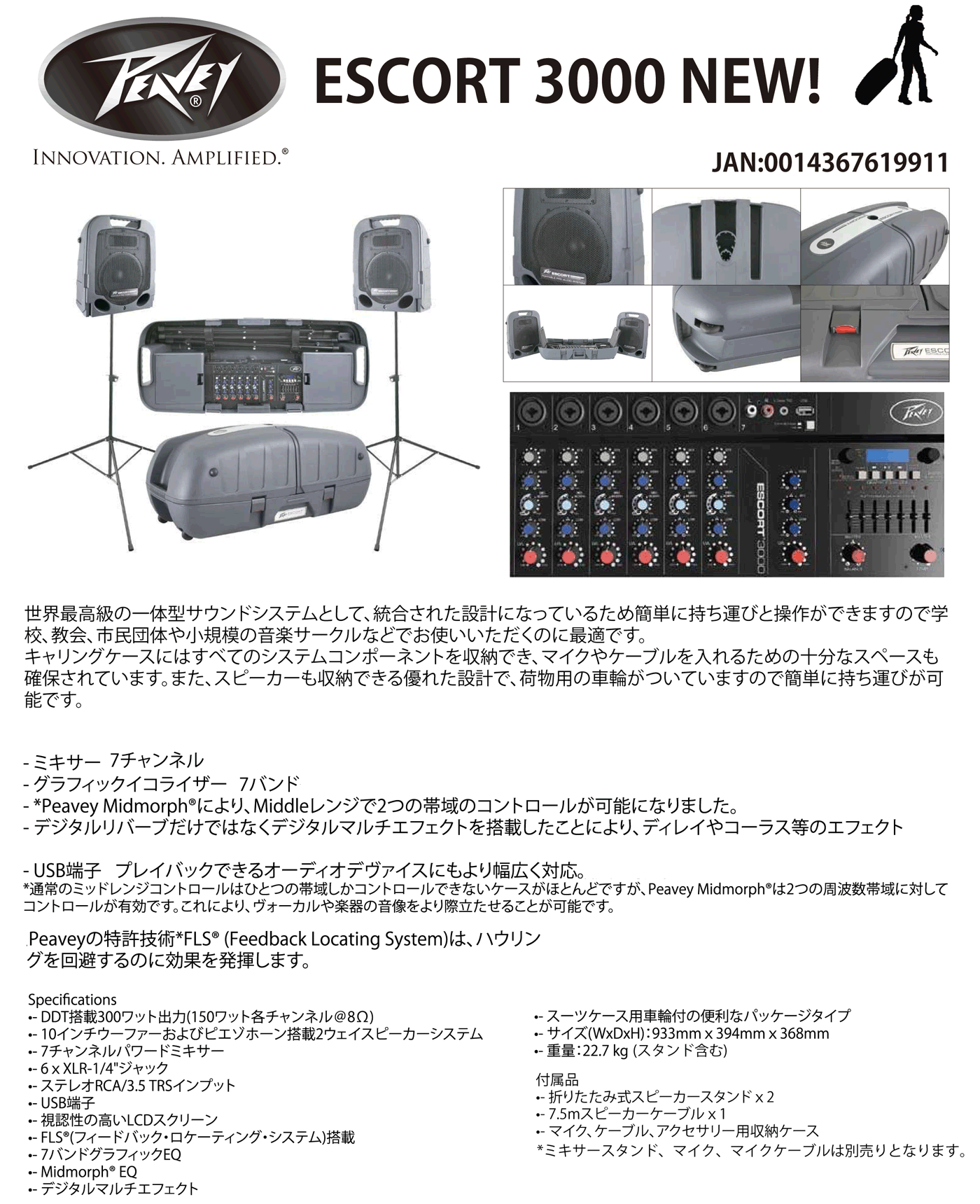 | ■ミキサーアンプ部 | 定格出力:100W (トータルインピーダンス4Ω) 入力端子:MIC IN (XLR)、LINE IN (1/4"フォーン)×4CH、CD/TAPE IN (RCAピン)L,R エフェクトループ端子:SEND、RETURN(1/4"フォーン) 外部出力:LINE OUT(RCA ピン)L,R W485×H145×D255mm 8.0Kg |