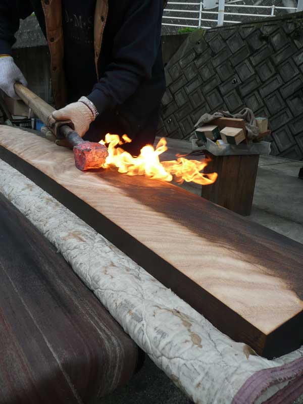 甲づくりの最終工程。甲に焼きごてを当て、桐の美しい木目を浮き出させます。