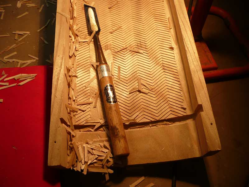 甲の裏面に音響効果と装飾効果をも兼ね備えた精緻な装飾模様の堀りです。神経を集中して作業します。