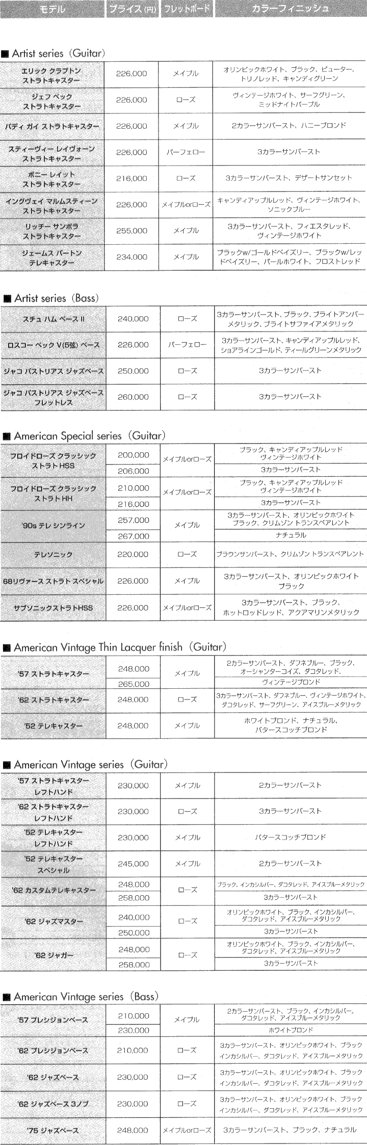 | アメリカンストラト | オリンピックホワイト、ブラック、アクアマリン、ホットロッドレッド | |